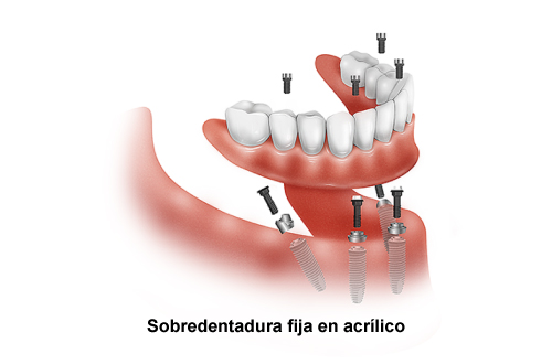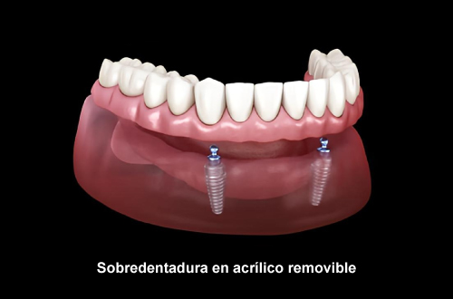 • Removable acrylic overdenture: It is a full-arch dental prosthesis indicated only for the lower jaw, which is attached to two implants by means of a security system or ball attachment, allowing it to be removable.