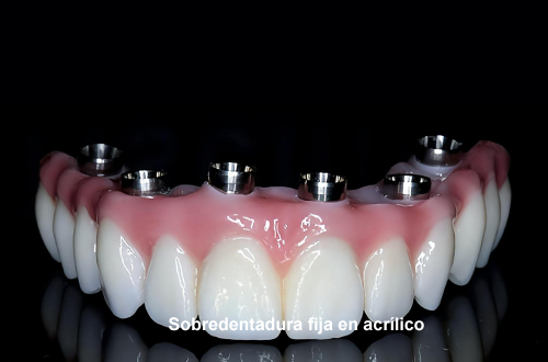 • Acrylic fixed overdenture: This is a full-arch dental prosthesis (replaces all the teeth of one or both arches) made of acrylic material, which is supported on 4, 6 or 8 implants in the maxilla.